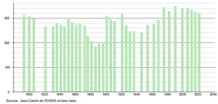 L'évolution du nombre d'habitants est connue à travers les recensements de la population effectués dans la commune depuis 1793. Pour les communes de moins de 10 000 habitants, une enquête de recensement portant sur toute la population est réalisée tous les cinq ans, les populations légales des années intermédiaires étant quant à elles estimées par interpolation ou extrapolation[16]. Pour la commune, le premier recensement exhaustif entrant dans le cadre du nouveau dispositif a été réalisé en 2006[17].