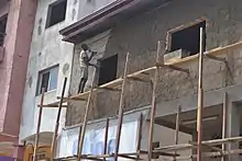 Maçon crépissant un mur au Cameroun.