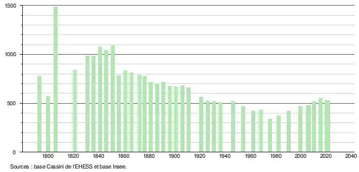 L'évolution du nombre d'habitants est connue à travers les recensements de la population effectués dans la commune depuis 1793. Pour les communes de moins de 10 000 habitants, une enquête de recensement portant sur toute la population est réalisée tous les cinq ans, les populations légales des années intermédiaires étant quant à elles estimées par interpolation ou extrapolation[21]. Pour la commune, le premier recensement exhaustif entrant dans le cadre du nouveau dispositif a été réalisé en 2005[22].