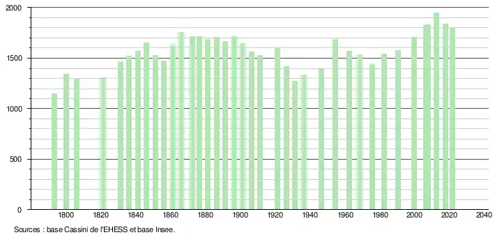 L'évolution du nombre d'habitants est connue à travers les recensements de la population effectués dans la commune depuis 1793. Pour les communes de moins de 10 000 habitants, une enquête de recensement portant sur toute la population est réalisée tous les cinq ans, les populations légales des années intermédiaires étant quant à elles estimées par interpolation ou extrapolation[34]. Pour la commune, le premier recensement exhaustif entrant dans le cadre du nouveau dispositif a été réalisé en 2007[35].