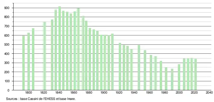 L'évolution du nombre d'habitants est connue à travers les recensements de la population effectués dans la commune depuis 1793. Pour les communes de moins de 10 000 habitants, une enquête de recensement portant sur toute la population est réalisée tous les cinq ans, les populations légales des années intermédiaires étant quant à elles estimées par interpolation ou extrapolation[21]. Pour la commune, le premier recensement exhaustif entrant dans le cadre du nouveau dispositif a été réalisé en 2006[22].