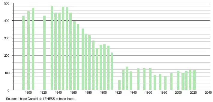 L'évolution du nombre d'habitants est connue à travers les recensements de la population effectués dans la commune depuis 1793. Pour les communes de moins de 10 000 habitants, une enquête de recensement portant sur toute la population est réalisée tous les cinq ans, les populations légales des années intermédiaires étant quant à elles estimées par interpolation ou extrapolation[29]. Pour la commune, le premier recensement exhaustif entrant dans le cadre du nouveau dispositif a été réalisé en 2005[30].