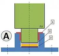 - Fig. A : dans le cas de charge moyenne et pour des diamètres inférieurs à 70 mm, l’arbre est guidé par un coussinet en bronze (1) et l’extrémité repose sur un contre-grain (2) qui pivote sur le grain (3) solidaire du palier. Dans certains cas le contre-grain peut être remplacé par un traitement thermique de l’extrémité du pivot (cémenté-trempé).