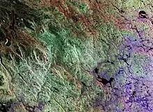 Photo satellite montrant l'anneau de lacs matérialisant le cratère, dont le lac Siljan au sud. | |