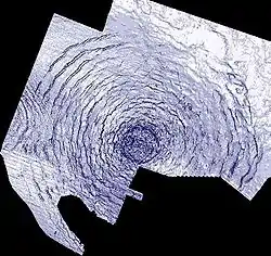 Vue en perspective de l'horizon sismique correspondant au toit de la craie, montrant la présence d'une dépression circulaire interprétée lors de sa découverte comme un « cratère » d'impact. Les fausses couleurs indiquent la profondeur (jaune/rouge=peu profond; bleu/pourpre=profond).