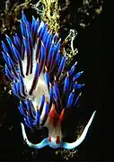 La tête, de la même couleur que le corps, est bien marquée, et présente des rhinophores (appendices sensoriels) orange vif et de longs tentacules buccaux blancs (souvent recourbés vers le haut, donnant l'allure de défenses d'éléphant), comportant à leur base des « taches oculaires » de la même couleur que les rhinophores[4].