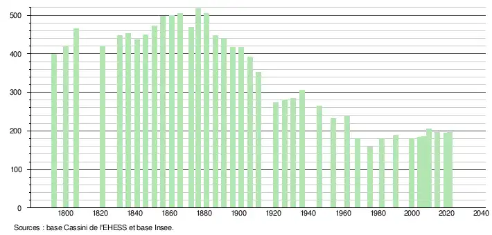 L'évolution du nombre d'habitants est connue à travers les recensements de la population effectués dans la commune depuis 1793. Pour les communes de moins de 10 000 habitants, une enquête de recensement portant sur toute la population est réalisée tous les cinq ans, les populations légales des années intermédiaires étant quant à elles estimées par interpolation ou extrapolation[16]. Pour la commune, le premier recensement exhaustif entrant dans le cadre du nouveau dispositif a été réalisé en 2004[17].