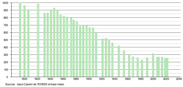L'évolution du nombre d'habitants est connue à travers les recensements de la population effectués dans la commune depuis 1793. Pour les communes de moins de 10 000 habitants, une enquête de recensement portant sur toute la population est réalisée tous les cinq ans, les populations légales des années intermédiaires étant quant à elles estimées par interpolation ou extrapolation[18]. Pour la commune, le premier recensement exhaustif entrant dans le cadre du nouveau dispositif a été réalisé en 2008[19].