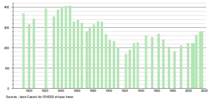 L'évolution du nombre d'habitants est connue à travers les recensements de la population effectués dans la commune depuis 1793. Pour les communes de moins de 10 000 habitants, une enquête de recensement portant sur toute la population est réalisée tous les cinq ans, les populations légales des années intermédiaires étant quant à elles estimées par interpolation ou extrapolation[12]. Pour la commune, le premier recensement exhaustif entrant dans le cadre du nouveau dispositif a été réalisé en 2004[13].