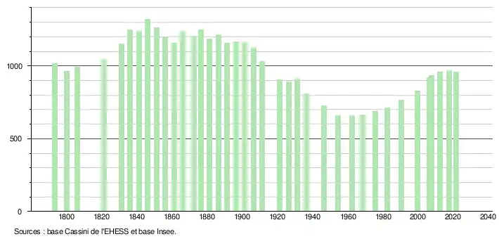 L'évolution du nombre d'habitants est connue à travers les recensements de la population effectués dans la commune depuis 1793. Pour les communes de moins de 10 000 habitants, une enquête de recensement portant sur toute la population est réalisée tous les cinq ans, les populations légales des années intermédiaires étant quant à elles estimées par interpolation ou extrapolation[16]. Pour la commune, le premier recensement exhaustif entrant dans le cadre du nouveau dispositif a été réalisé en 2007[17].