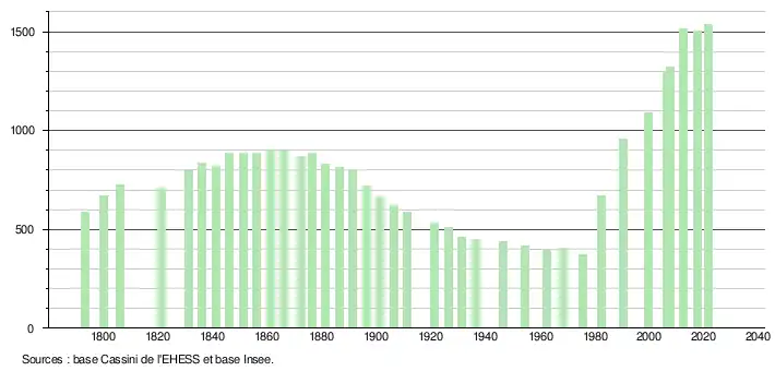 L'évolution du nombre d'habitants est connue à travers les recensements de la population effectués dans la commune depuis 1793. Pour les communes de moins de 10 000 habitants, une enquête de recensement portant sur toute la population est réalisée tous les cinq ans, les populations légales des années intermédiaires étant quant à elles estimées par interpolation ou extrapolation[21]. Pour la commune, le premier recensement exhaustif entrant dans le cadre du nouveau dispositif a été réalisé en 2007[22].
