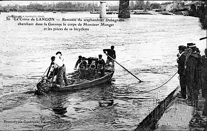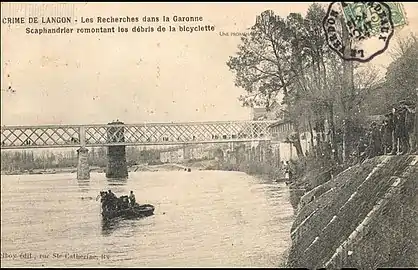 - Le 3 avril, les membres du parquet se rendent à Langon, à l'endroit indiqué par Gasol et Parrot, près du pont neuf. Le scaphandrier plonge, et vers 10h 45, il retrouve les roues et le porte-bagages de la bicyclette de Monget.