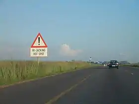 L'Afrique du Sud détient un des taux de piraterie routière (ou carjacking) les plus élevés pour un pays industrialisé[11]. On estime qu'en 1998, 16 000 voitures étaient ainsi volées chaque année[12]. En 2016, le Institute for Security Studies compte 14 602 de ces attaques, en hausse de 14 % par rapport à l'an passé, avec les chiffres les plus élevés dans le Gauteng et le KwaZulu-Natal[13]. Les attaques se produisent le plus souvent dans certaines zones, parfois signalés par des panneaux, appelées hi-jacking hotspot[14].