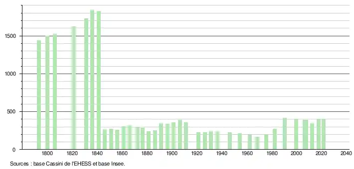 L'évolution du nombre d'habitants est connue à travers les recensements de la population effectués dans la commune depuis 1793. Pour les communes de moins de 10 000 habitants, une enquête de recensement portant sur toute la population est réalisée tous les cinq ans, les populations légales des années intermédiaires étant quant à elles estimées par interpolation ou extrapolation[23]. Pour la commune, le premier recensement exhaustif entrant dans le cadre du nouveau dispositif a été réalisé en 2007[24].