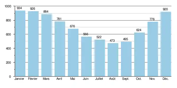 Elle présente des fluctuations saisonnières de débit peu importantes, avec des hautes eaux d'hiver portant le débit mensuel moyen à un niveau situé entre 0,89 et 0,934 m3/s, de décembre à avril inclus (maximum en janvier), et des basses eaux d'été de juin à début octobre, avec une baisse du débit moyen mensuel jusque 0,473 m3/s au mois d'août (473 litres par seconde), ce qui est encore abondant proportionnellement au module de la rivière.