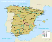 Les premières faillites de sociétés de crédit liées aux compagnies ferroviaires se produisirent en 1864, comme celle de la Caisse générale de crédit française, avec un siège à Madrid, qui suspendit les paiements en raison de la faible rentabilité de la ligne Séville-Jerez-Cadix dont elle était le principal actionnaire, ou la Banque de Valladolid. En mai 1866, la crise affecta deux importantes sociétés de crédit de Barcelone, la Catalane générale de crédit et le Crédit mobilier barcelonais, ce qui causa une vague de panique[41]. Le mois suivant se produisait le soulèvement manqué de la caserne d'artillerie de San Gil, ce qui ajouta la crise politique à la crise économique, compliquant encore cette dernière[42].