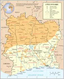 La crise politico-militaire en Côte d'Ivoire commence le , lorsque des soldats rebelles dont certains seraient venus du Burkina Faso[4] tentent de prendre le contrôle des villes d'Abidjan, Bouaké et Korhogo[5]. Ils échouent dans leur tentative de prendre Abidjan mais parviennent à occuper les deux autres villes, respectivement dans le centre et le Nord du pays.