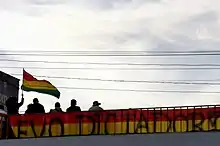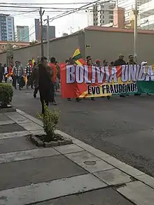 La crise post-électorale bolivienne de 2019 — qualifiée par plusieurs acteurs majeurs de « putsch »[alpha 1] ou de « coup d'État »[alpha 2] —, désigne la période d'instabilité sociale et politique ayant eu lieu en Bolivie après la diffusion des premiers résultats des élections générales du , qui donnaient vainqueur le président sortant Evo Morales dès le premier tour[2],[3],[4],[5]. Le parti vaincu, la Communauté civique, ainsi que certains acteurs de la société civile, notamment le Comité civique pro-Santa Cruz, en appellent à la grève générale afin de protester contre ces résultats et répondre à ce qu'ils dénoncent comme de la fraude électorale. Des manifestations et des affrontements entre partisans du président et opposants éclatent un peu partout dans le pays.