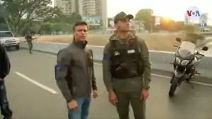 Le 30 avril, Leopoldo López, homme politique arrêté en 2014 et en résidence surveillée, est libéré par des militaires pro-Guaido du SEBIN[136]. Guaidó et López se rendent devant la base militaire de La Carlota. Dans une vidéo, accompagné par des militaires vénézuéliens, Guaidó appelle les Vénézuéliens et l'armée à le soutenir pour mettre fin « définitivement à l'usurpation » de Nicolas Maduro[137]. Le ministre de l’intérieur Jorge Rodríguez s'exprime : « Nous informons le peuple du Venezuela qu'en ce moment, nous affrontons et neutralisons un petit groupe de traîtres de l'armée qui a pris position sur l'échangeur autoroutier d'Altamira pour mener un coup d'État »[137].