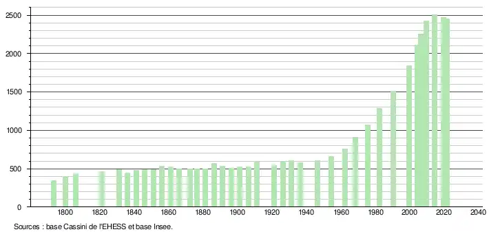 L'évolution du nombre d'habitants est connue à travers les recensements de la population effectués dans la commune depuis 1793. Pour les communes de moins de 10 000 habitants, une enquête de recensement portant sur toute la population est réalisée tous les cinq ans, les populations légales des années intermédiaires étant quant à elles estimées par interpolation ou extrapolation[37]. Pour la commune, le premier recensement exhaustif entrant dans le cadre du nouveau dispositif a été réalisé en 2004[38].