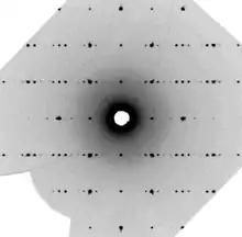 Les diagrammes de diffraction des cristaux apériodiques possèdent deux ensembles de pics, qui comprennent les « réflexions principales » et les « réflexions satellites »[1]. Les réflexions principales sont dans. la grande majorité plus intenses et couvrent un réseau défini par des vecteurs de réseau réciproques tridimensionnels . Les réflexions satellites sont moins intenses et sont connues sous le nom de « fantômes de réseau » ou « pics de diffraction satellites ». Ces réflexions ne correspondent à aucun point du réseau dans l'espace physique et ne peuvent pas être indexées avec les trois vecteurs d'origine. Pour comprendre les structures cristallines apériodiques, il est nécessaire d'adopter l'approche du « super-espace »[3]. En science des matériaux, le super-espace (ou superspace) ou espace de dimension supérieure est développé avec le concept de description des structures et des propriétés des matériaux en termes de dimensions au-delà des trois dimensions classiques. Il permet l'utilisation de modèles mathématiques pour décrire le comportement des atomes ou des molécules dans un matériau en quatre dimensions, cinq, voire plus[4].