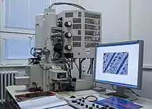 La cristallographie électronique est une méthode permettant de déterminer la disposition des atomes dans les solides à l'aide d'un microscope électronique à transmission (MET ou (en) TEM). Cela peut impliquer l’utilisation d’images de microscopie électronique à transmission à haute résolution (HRTEM), de diagrammes de diffraction électronique, dont la diffraction électronique à faisceau convergent, ou de combinaisons de ceux-ci. Elle a été capable de déterminer certaines structures globales, ainsi que des structures superficielles[1],[2]. Il existe deux méthodes apparentées que sont la diffraction d’électrons lents, qui a permis de résoudre la structure de nombreuses surfaces, et la diffraction d'électrons de haute énergie en incidence rasante, utilisée généralement pour observer les surfaces pendant la croissance.
