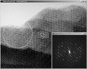 On peut aussi utiliser des diagrammes de diffraction électronique (ED) pour déterminer une structure cristalline, en complément de la microscopie électronique[21],[22]. Un soin particulier doit être pris lors de l'enregistrement de ces motifs de diffraction à partir des zones les plus minces afin de préserver la plupart des variations d'intensité liées à la structure entre les réflexions (conditions de diffraction quasi-cinématiques). Tout comme pour les diagrammes de diffraction des rayons X, les phases cruciales du facteur de structure cristallographique sont perdues dans les diagrammes de diffraction électronique et doivent être déterminées par des méthodes cristallographiques particulières telles que les méthodes directes, la maximisation de la vraisemblance ou (plus récemment) la méthode de retournement de phase. Par ailleurs, les motifs de diffraction électronique des cristaux inorganiques ont souvent une résolution élevée (en raison des espacements interplanaires avec des indices de Miller élevés) bien inférieure à 1 Ångström. Ceci est comparable à la résolution spatiale des meilleurs microscopes électroniques. Dans des conditions favorables, il est possible d'utiliser des données de diffraction électronique à partir d'une seule orientation pour en déterminer la structure cristalline complète[23]. Une approche hybride peut être utilisée, combinant des images de microscopie électronique en transmission à haute résolution (HRTEM) pour la résolution et des intensités de diffraction électronique (ED) pour affiner la structure cristalline[24],[25].