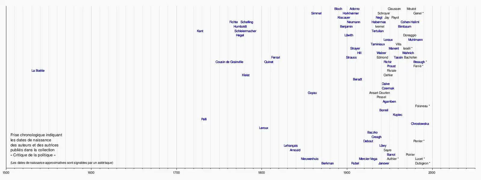 Louis JanoverMaximilien RubelAlexandre BerkmanLouis Mercier-VegaFerdinand Domela NieuwenhuisGilles DauvéArthur ArnouldMichael LöwyGustave LefrançaisSimone Debout-OleszkiewiczRonald CreaghBronisław BaczkoPierre LerouxSylwia D. ChrostowskaGiuseppe Bencivenni PelliAnne KupiecJean BorreilGiorgio AgambenJean-Marie GuyauMarcel CzermakJean DaiveCharlotte BeradtHeinrich von KleistÉtienne de La BoétieFrançoise ProustMartin BreaughMarc RichirEdgar QuinetJean-Baptiste Cousin de GrainvilleÉtienne TassinLeo StraussGiuseppe FerrariSophie WahnichMichael WalzerChristopher Hill (historien)Pierre ManentJoseph StrayerJacques TaminiauxGéraldine MuhlmannNicole LorauxKarl LöwithGeorg Wilhelm Friedrich HegelNicolas TertulianFriedrich SchleiermacherEmmanuel KantAntonia BirnbaumWalter BenjaminWilhelm von HumboldtMichèle Cohen-HalimiJürgen HabermasFranz Leopold NeumannFriedrich Wilhelm Joseph von SchellingJohann Gottlieb FichteOskar NegtSiegfried KracauerMax HorkheimerGeorg SimmelTheodor W. AdornoErnst Bloch