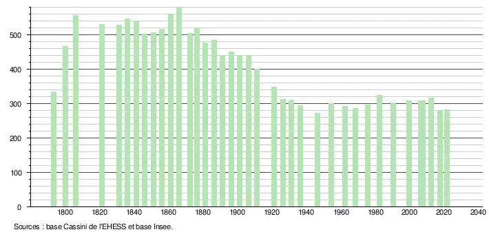 L'évolution du nombre d'habitants est connue à travers les recensements de la population effectués dans la commune depuis 1793. Pour les communes de moins de 10 000 habitants, une enquête de recensement portant sur toute la population est réalisée tous les cinq ans, les populations légales des années intermédiaires étant quant à elles estimées par interpolation ou extrapolation[37]. Pour la commune, le premier recensement exhaustif entrant dans le cadre du nouveau dispositif a été réalisé en 2007[38].