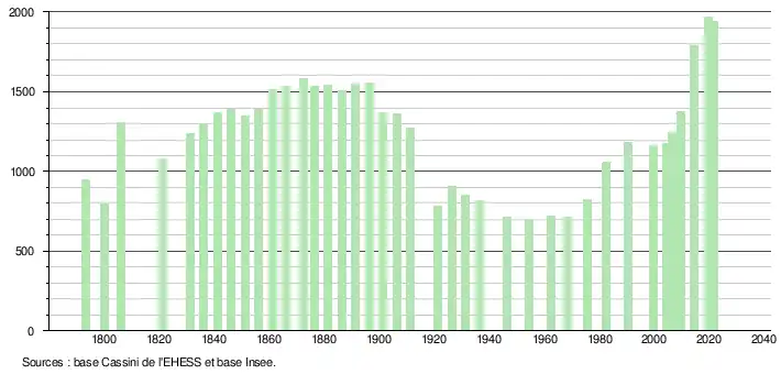L'évolution du nombre d'habitants est connue à travers les recensements de la population effectués dans la commune depuis 1793. Pour les communes de moins de 10 000 habitants, une enquête de recensement portant sur toute la population est réalisée tous les cinq ans, les populations légales des années intermédiaires étant quant à elles estimées par interpolation ou extrapolation[38]. Pour la commune, le premier recensement exhaustif entrant dans le cadre du nouveau dispositif a été réalisé en 2004[39].