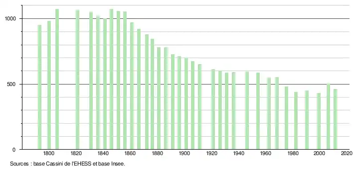 L'évolution du nombre d'habitants est connue à travers les recensements de la population effectués dans la commune depuis 1793. À partir du , les populations légales des communes sont publiées annuellement dans le cadre d'un recensement qui repose désormais sur une collecte d'information annuelle, concernant successivement tous les territoires communaux au cours d'une période de cinq ans. Pour les communes de moins de 10 000 habitants, une enquête de recensement portant sur toute la population est réalisée tous les cinq ans, les populations légales des années intermédiaires étant quant à elles estimées par interpolation ou extrapolation[23]. Pour la commune, le premier recensement exhaustif entrant dans le cadre du nouveau dispositif a été réalisé en 2006[24],[Note 4].