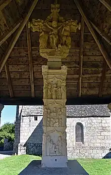 Le fût de la croix est carré et comporte 3 scènes de la vie du Christ figurées sur chacune de ses faces[A 2].
