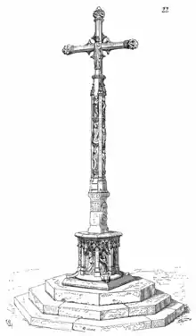 Surmontant l'ensemble, une croix de section hexagonale décorée de feuilles et de fleurs de lis. Les montants sont reliés par des arcs trilobés. Sur un des côtés, un christ couronné d'épines est sculpté et de l'autre côté une Vierge à l'enfant[1].