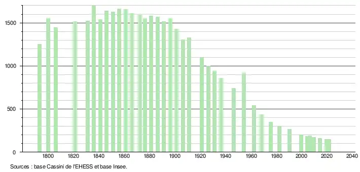 L'évolution du nombre d'habitants est connue à travers les recensements de la population effectués dans la commune depuis 1793. Pour les communes de moins de 10 000 habitants, une enquête de recensement portant sur toute la population est réalisée tous les cinq ans, les populations légales des années intermédiaires étant quant à elles estimées par interpolation ou extrapolation[17]. Pour la commune, le premier recensement exhaustif entrant dans le cadre du nouveau dispositif a été réalisé en 2004[18].