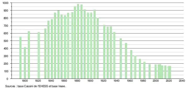 L'évolution du nombre d'habitants est connue à travers les recensements de la population effectués dans la commune depuis 1793. Pour les communes de moins de 10 000 habitants, une enquête de recensement portant sur toute la population est réalisée tous les cinq ans, les populations légales des années intermédiaires étant quant à elles estimées par interpolation ou extrapolation[24]. Pour la commune, le premier recensement exhaustif entrant dans le cadre du nouveau dispositif a été réalisé en 2004[25].
