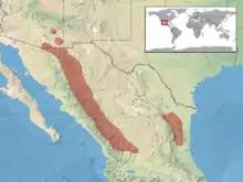 - au Mexique dans l'ouest du Sonora, dans l'est du Chihuahua, dans l'Ouest du Durango, dans le sud-est du Coahuila, dans le sud du Nuevo León, dans le sud-ouest du Tamaulipas et dans l’État d'Aguascalientes.