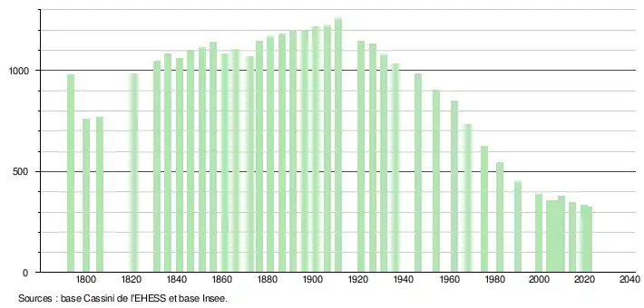 L'évolution du nombre d'habitants est connue à travers les recensements de la population effectués dans la commune depuis 1793. Pour les communes de moins de 10 000 habitants, une enquête de recensement portant sur toute la population est réalisée tous les cinq ans, les populations légales des années intermédiaires étant quant à elles estimées par interpolation ou extrapolation[33]. Pour la commune, le premier recensement exhaustif entrant dans le cadre du nouveau dispositif a été réalisé en 2004[34].
