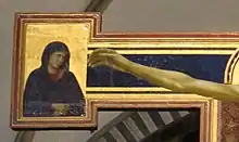 Les deux pleureuses aux extrémités des bras de la croix sont représentées latéralement et non pas avec une vue frontale comme pour le Crucifix de Santa Croce de Cimabue,quinze ans plus tôt. Elles sont plus volumétriques du fait de leur pose, des gonflements de la draperie, de l'attention portée à l'origine de la seule source de lumière.