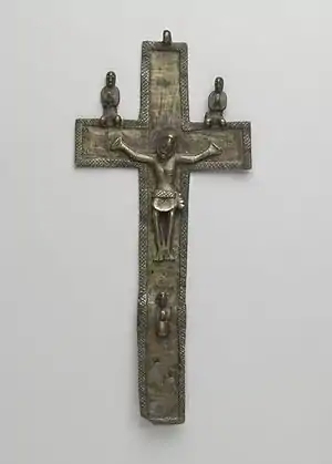 Crucifix de chef kongo, alliage cuivreux, bois, plomb et clous de charpentier, XVIIe ou XVIIIe siècle, collection privée (exposé au musée du quai Branly dans le cadre de l'exposition « Du Jourdain au Congo - Art et christianisme en Afrique centrale », 2016-2017).