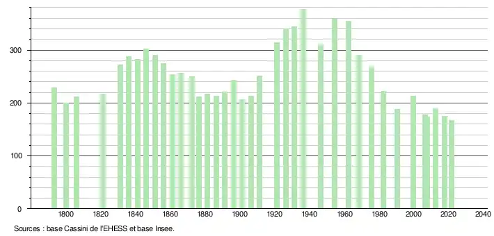 L'évolution du nombre d'habitants est connue à travers les recensements de la population effectués dans la commune depuis 1793. Pour les communes de moins de 10 000 habitants, une enquête de recensement portant sur toute la population est réalisée tous les cinq ans, les populations légales des années intermédiaires étant quant à elles estimées par interpolation ou extrapolation[13]. Pour la commune, le premier recensement exhaustif entrant dans le cadre du nouveau dispositif a été réalisé en 2007[14].