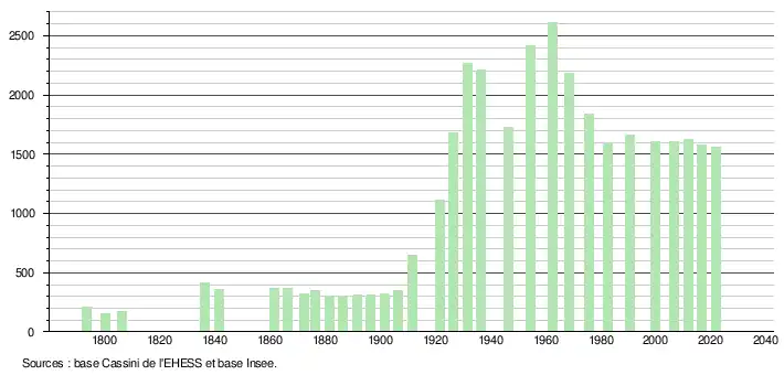 L'évolution du nombre d'habitants est connue à travers les recensements de la population effectués dans la commune depuis 1793. Pour les communes de moins de 10 000 habitants, une enquête de recensement portant sur toute la population est réalisée tous les cinq ans, les populations légales des années intermédiaires étant quant à elles estimées par interpolation ou extrapolation[22]. Pour la commune, le premier recensement exhaustif entrant dans le cadre du nouveau dispositif a été réalisé en 2006[23].