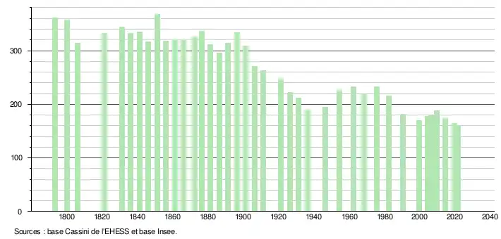 L'évolution du nombre d'habitants est connue à travers les recensements de la population effectués dans la commune depuis 1793. Pour les communes de moins de 10 000 habitants, une enquête de recensement portant sur toute la population est réalisée tous les cinq ans, les populations légales des années intermédiaires étant quant à elles estimées par interpolation ou extrapolation[18]. Pour la commune, le premier recensement exhaustif entrant dans le cadre du nouveau dispositif a été réalisé en 2004[19].