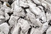 Restauration, en hiver, d'un mur ancien. Les pierres incluses dans le mur n'ont pas gelé (inertie thermique), mais celles qui étaient déposées au sol ont éclaté sous l'effet du froid (détail ci-dessous).