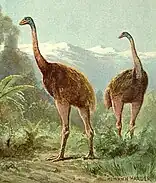 Oiseau aptère au long cou de moins de 1 m de haut (sa taille est parfois comparée à celle d'une dinde). | Île du Sud (Nouvelle-Zélande). | Moa relique (Megalapteryx ou anomalopteryx), observation déficiente de takahés. |