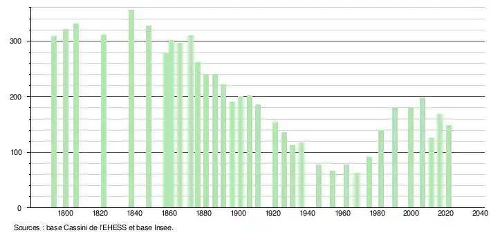L'évolution du nombre d'habitants est connue à travers les recensements de la population effectués dans la commune depuis 1793. Pour les communes de moins de 10 000 habitants, une enquête de recensement portant sur toute la population est réalisée tous les cinq ans, les populations légales des années intermédiaires étant quant à elles estimées par interpolation ou extrapolation[34]. Pour la commune, le premier recensement exhaustif entrant dans le cadre du nouveau dispositif a été réalisé en 2006[35].