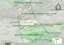 - le « massif du Fenouillèdes septentrional » (14 046 ha), couvrant 14 communes dont 9 dans l'Aude et 5 dans les Pyrénées-Orientales[21].