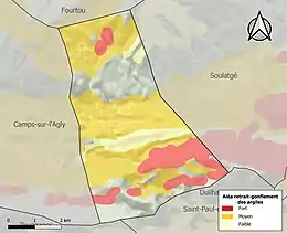 Le retrait-gonflement des sols argileux est susceptible d'engendrer des dommages importants aux bâtiments en cas d’alternance de périodes de sécheresse et de pluie. 65,3 % de la superficie communale est en aléa moyen ou fort (75,2 % au niveau départemental et 48,5 % au niveau national). Sur les 77 bâtiments dénombrés sur la commune en 2019, 76 sont en aléa moyen ou fort, soit 99 %, à comparer aux 94 % au niveau départemental et 54 % au niveau national. Une cartographie de l'exposition du territoire national au retrait gonflement des sols argileux est disponible sur le site du BRGM[27],[Carte 3].