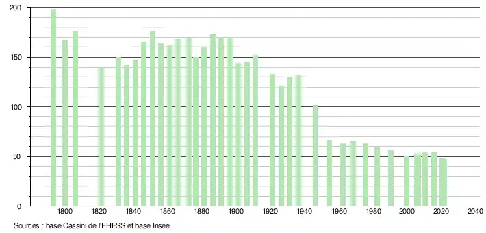 L'évolution du nombre d'habitants est connue à travers les recensements de la population effectués dans la commune depuis 1793. Pour les communes de moins de 10 000 habitants, une enquête de recensement portant sur toute la population est réalisée tous les cinq ans, les populations légales des années intermédiaires étant quant à elles estimées par interpolation ou extrapolation[35]. Pour la commune, le premier recensement exhaustif entrant dans le cadre du nouveau dispositif a été réalisé en 2005[36].