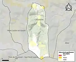 Le retrait-gonflement des sols argileux est susceptible d'engendrer des dommages importants aux bâtiments en cas d’alternance de périodes de sécheresse et de pluie. 1,5 % de la superficie communale est en aléa moyen ou fort (15,8 % au niveau départemental et 48,5 % au niveau national). Sur les 54 bâtiments dénombrés sur la commune en 2019, aucun n'est en aléa moyen ou fort, à comparer aux 14 % au niveau départemental et 54 % au niveau national. Une cartographie de l'exposition du territoire national au retrait gonflement des sols argileux est disponible sur le site du BRGM[29],[Carte 2].