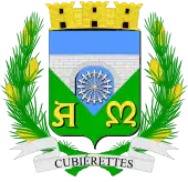 Le pont représente celui de Broussous et celui qui est dit Salien. La roue d’argent indique la présence de plusieurs moulins sur le Jouvain. L'azur symbolise les cours d'eau communaux dont le Jouvain qui traverse le village. La partie sinople représente à la fois les pâturages communaux et les forêts qui enserrent et surplombent Cubiérettes. Les lettres A et M (Pour Ave Maria) indiquent que la sainte Vierge est la sainte patronne de l'église qui remonte au XIIe siècle. Les ornements sont deux branches de sapin de sinople, fruitées d'or, mises en sautoir par la pointe et liées d'or ; c'est une des essences qui couvrent les grandes forêts de la commune. Le listel d'argent porte le nom de la commune en lettres majuscules de sable. La couronne de tours dit que l’écu est celui d’une commune ; elle n’a rien à voir avec des fortifications.Le statut officiel du blason reste à déterminer. |